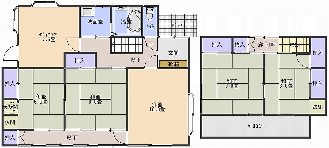5DK 1階:洋室10畳、和室8畳、和室6畳 2階:和室8畳、和室6畳